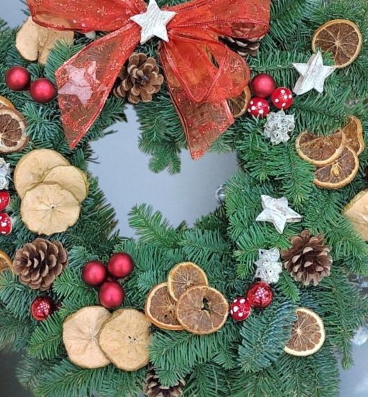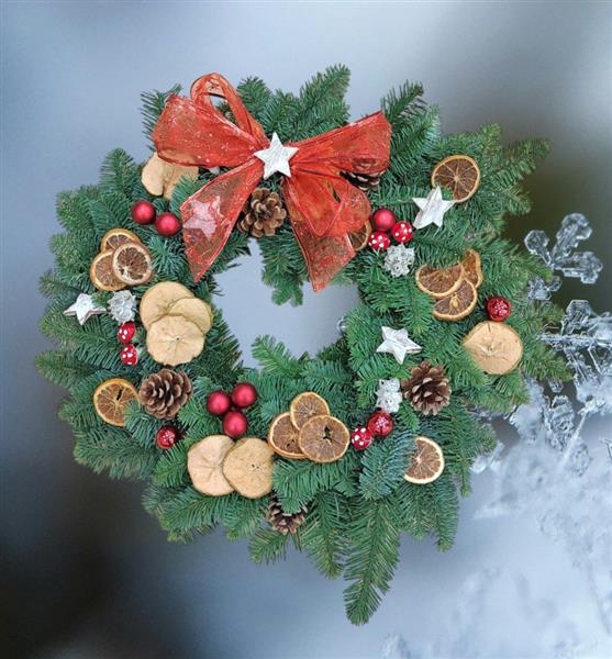 A 30cm Festive Advent wreath, bound and decorated with seasonal berries, fruit and baubles. (Decorations may vary).