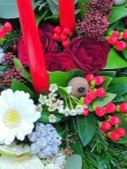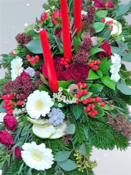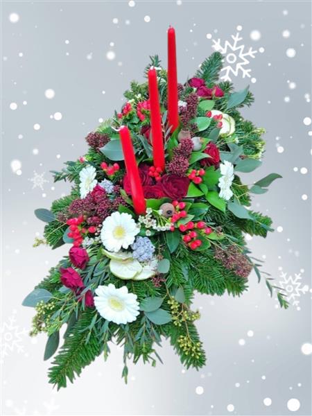 A 3 foot Christmas table arrangement with a pine and eucalyptus base. The colours in this arrangement can be changed to fit in with your colour scheme. When ordering please tell us your main colour choice in the delivery instruction or call us. Flower choice will be determent by your colour choice.