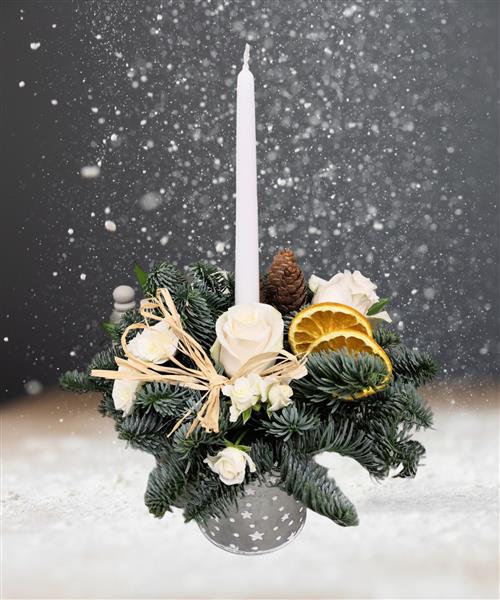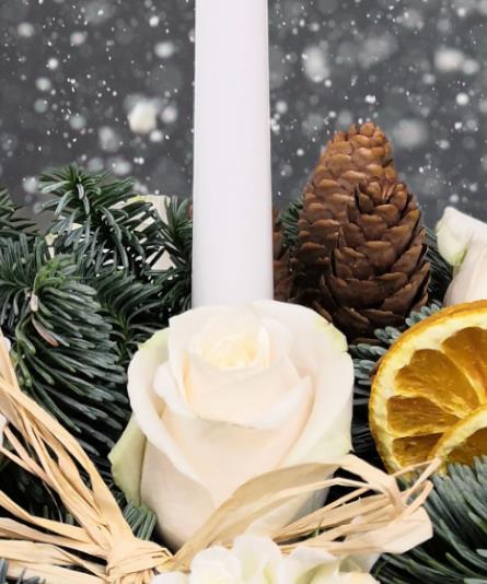 Scented spruce, cinnamon, orange slices and white roses combine to make this beautiful Christmas, candle table centre.