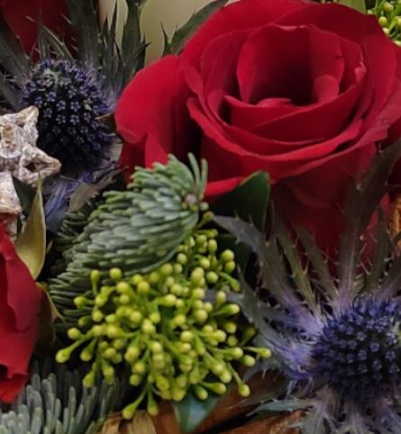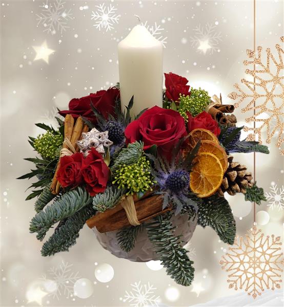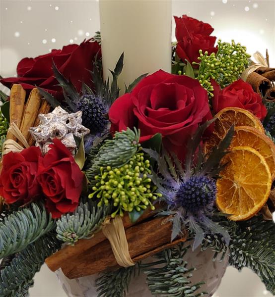 Lovely table centre set in a rustic ceramic pot. Features red seasonal flowers, festive foliages, decorations and a chunky church candle.
