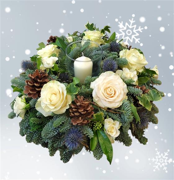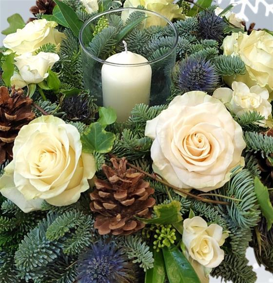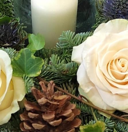 Centre table Christmas arrangement with candle in a storm vase, surrounded by oasis with pine fresh, winter foliage flowers and cones