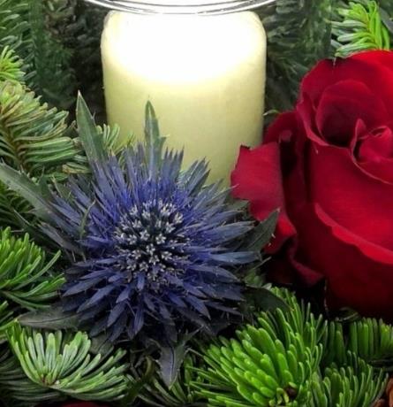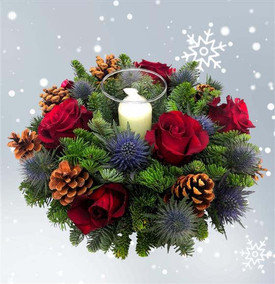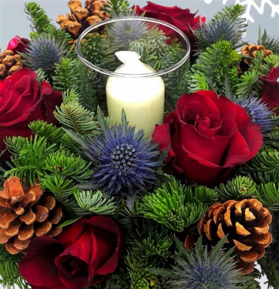 A Christmas Centre table arrangement with a candle in a storm vase, surrounded by oasis with pine fresh, winter foliage, flowers and cones.