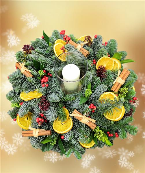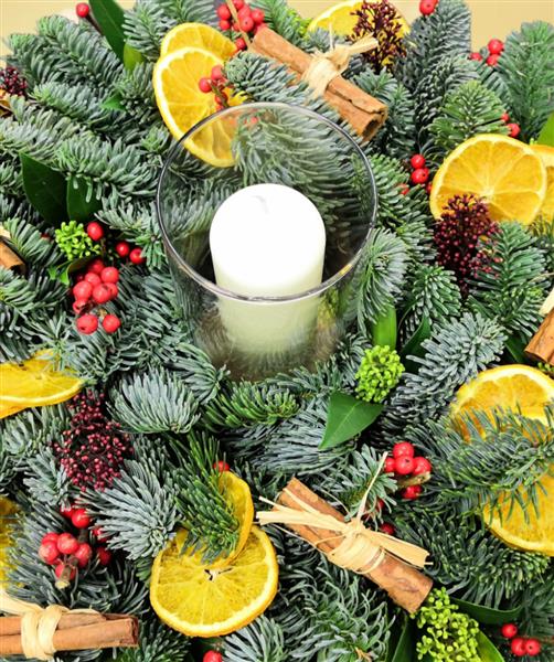 A beautiful scented Christmas candle table arrangement made of fresh noble pine, mixed with orange slices and cinnamon. The perfect scent of Christmas for your festive table.