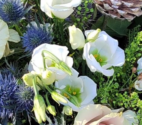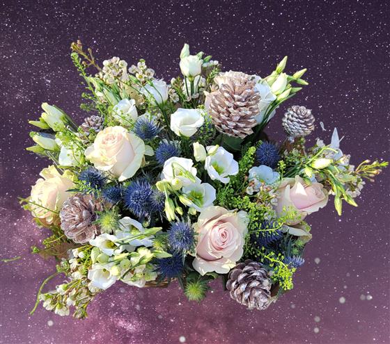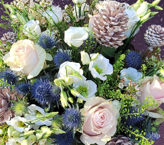 A beautiful fresh bouquet of pastal Roses, blue Eryngium, pine cones and white Lizzies. The perfect gift to celebrate Christmas and the new year.