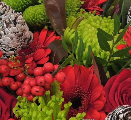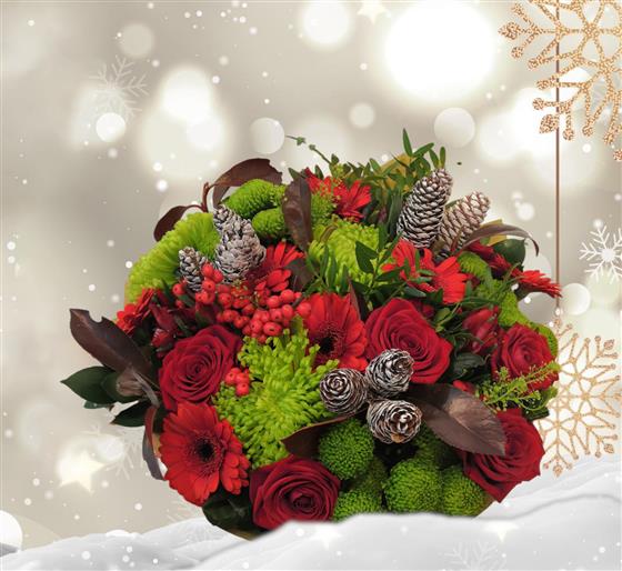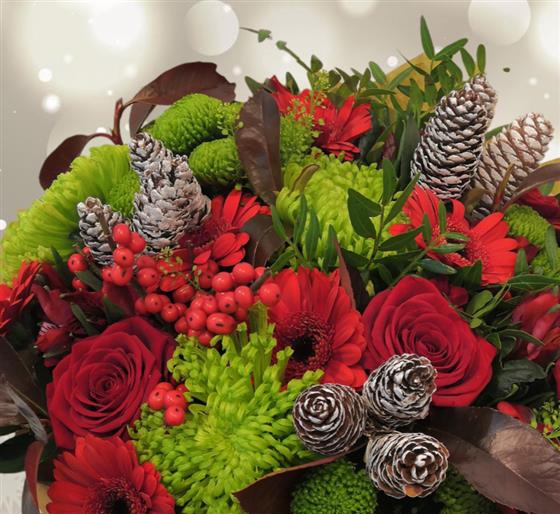 A Christmas bouquet with roses and green Chrysanthemum and seasonal foliage.