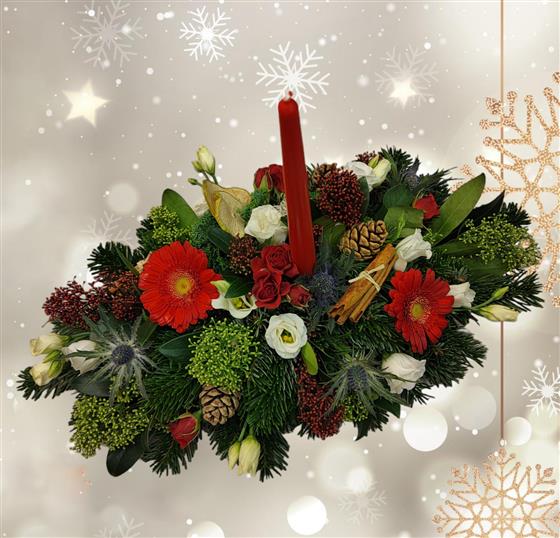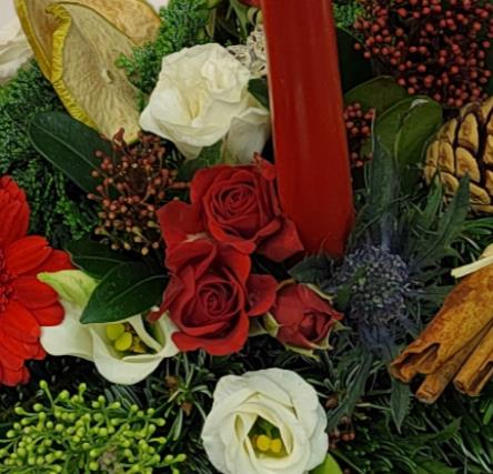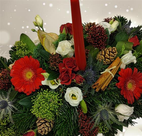 Christmas candle table decoration in traditional Christmas colours. Flowers used include red Roses, white Lisianthus, winer berries and seasonal foliage.