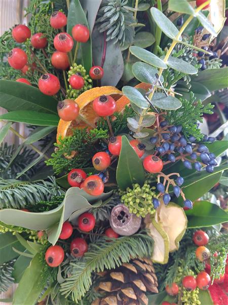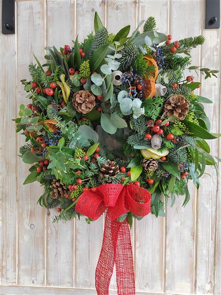 A Hand bound door wreath of seasonal foliage and berries. Approximately 45cm diameter.